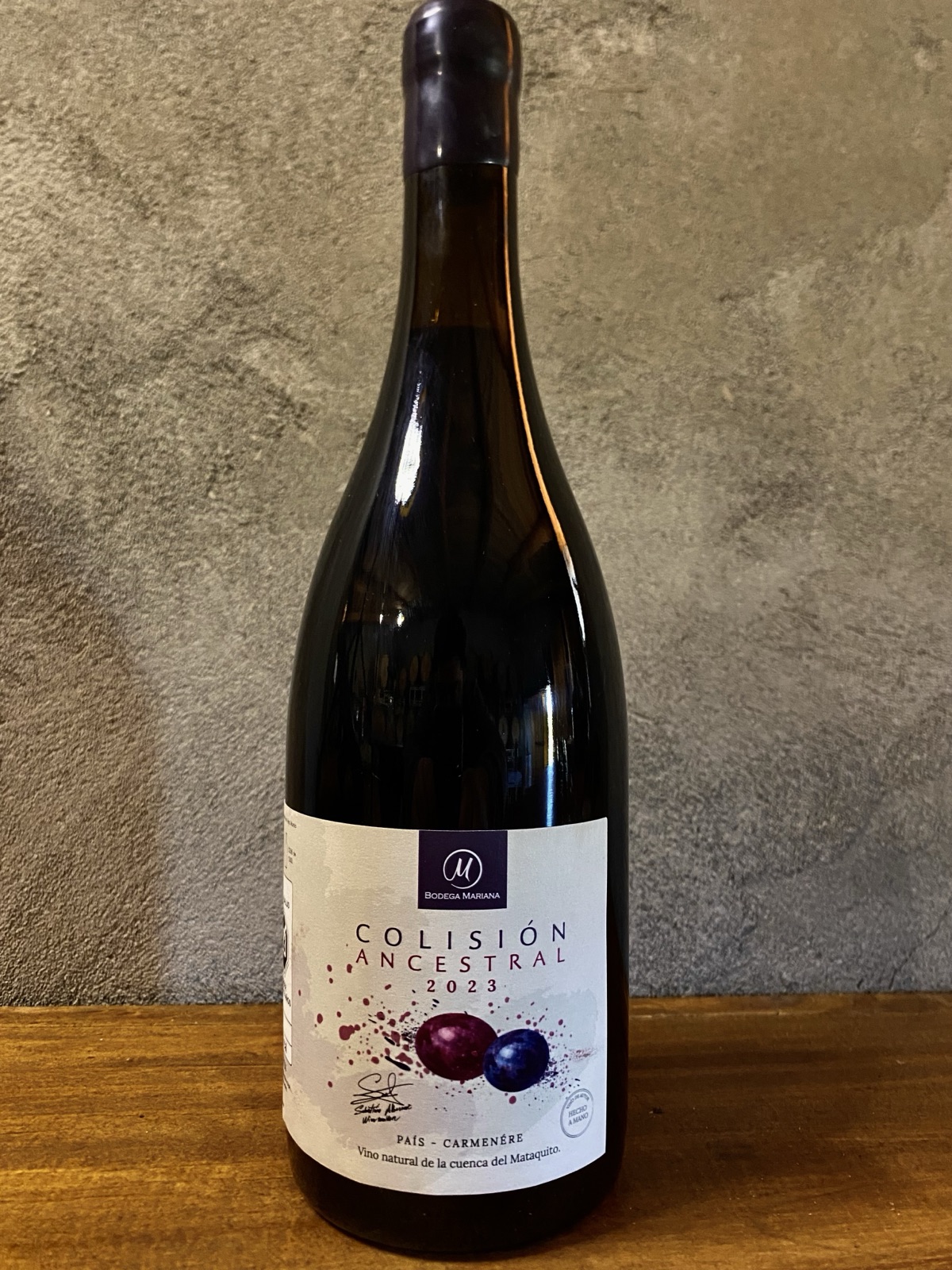 El encuentro de dos cepas: patrimonio y modernidad. Blend único 60% País (parras de 1973) + 40% Carménère (1992), fermentado con levaduras nativas y criado 24 meses en barrica. Aromas a frutos negros, especias y un fondo mineral granítico; boca carnosa con taninos firmes y frescura propia de la cuenca del Mataquito. Edición limitada a 1.200 botellas.
